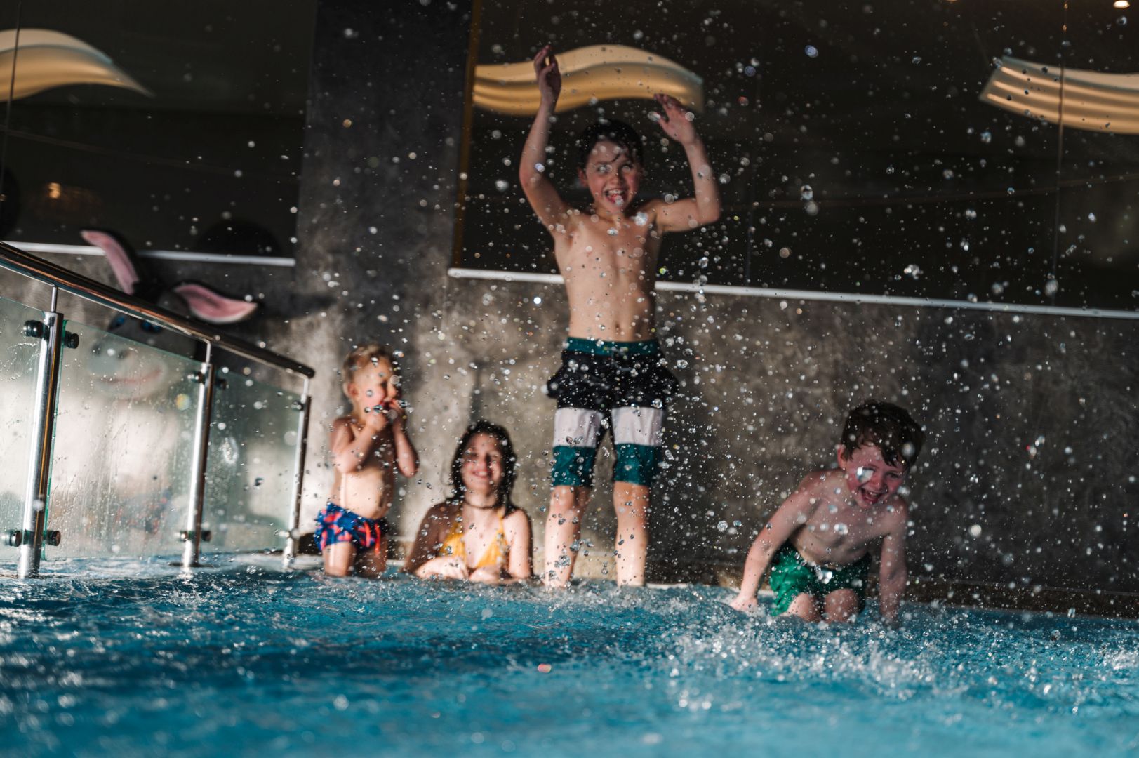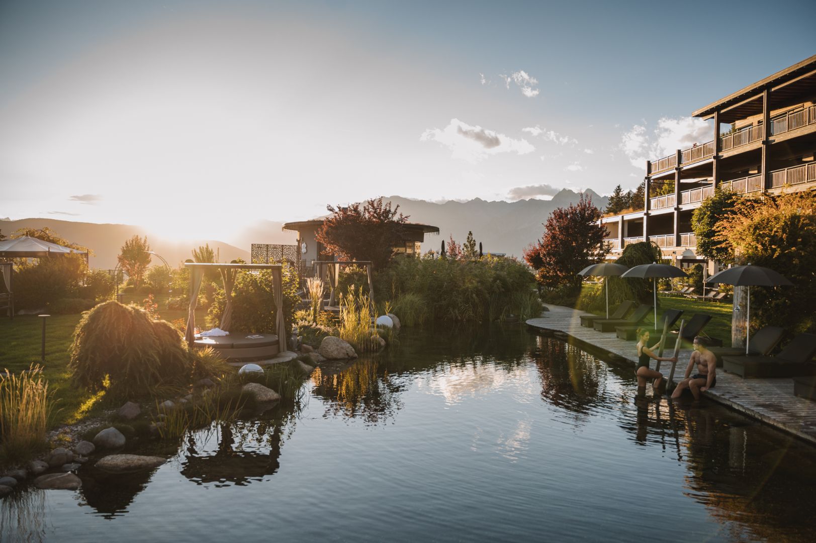 Family Spa mit großzügigem Hallenbad (14m) im Chalet Stil mit Schleuse zum beheizten Outdoor-Pool (16m) mit Whirlbereich, Massagedüsen (32°C). Längster Naturbadeteich Südtirols mit eigenem Quellwasser von Frühling bis Herbst. Im Winter ist der Teich als Tauchbecken nutzbar, eine wahre Wohltat für Körper und Geist. Zudem bietet der Family Spa Bereich eine große Liegewiese mit einer atemberaubenden Aussicht, exklusiver Außen Whirlpool (35°C), Kinderbecken, Erlebnisdusche und Kneipptretbecken.